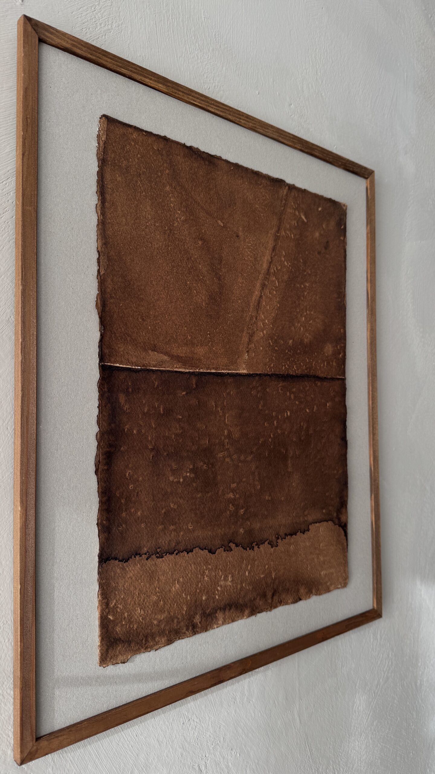 Each piece is painted in pigment on handmade 100% cotton paper, a beautifully textured material with soft, naturally uneven edges and subtle irregularities. The dark, earthy tones and organic imperfections give each sheet a quiet, wabi-sabi charm, perfect for adding depth and warmth to any interior.