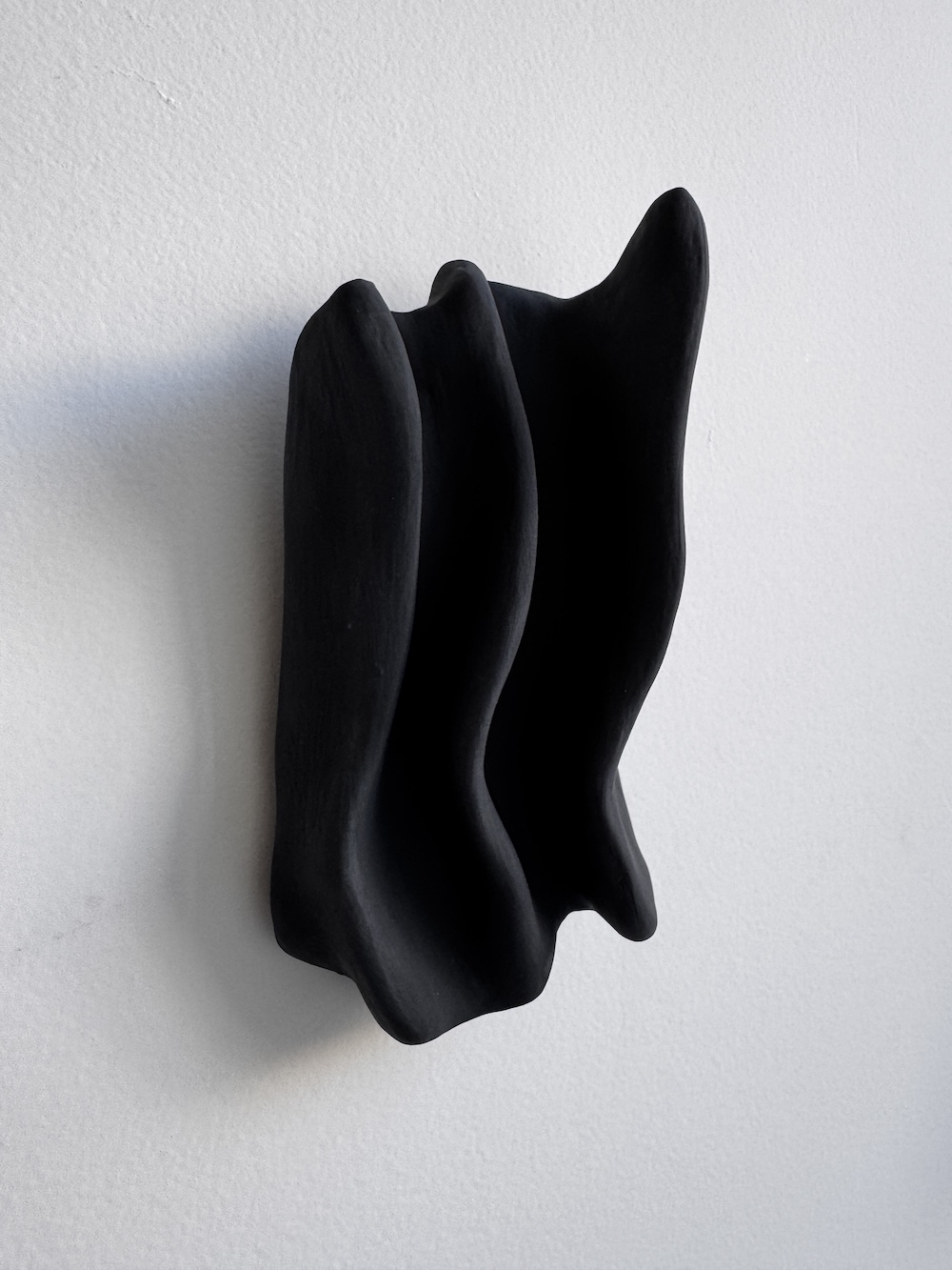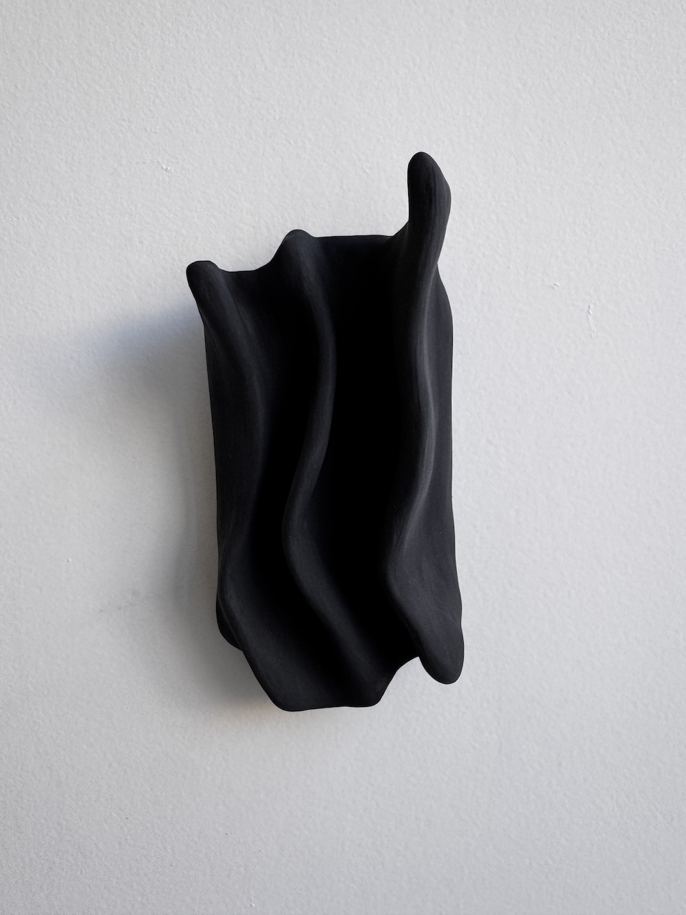 A one-of-a-kind petite collector sculpture in deep black mineral texture, shaped with soft flowing contours that shift subtly with light.